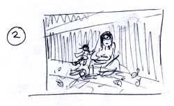 FADE IN to LS (long shot): wide view of subway entrance sounds of traffic OS (offscreen) Rachel pushing Danny in buggy bumping down long flight of steps at end of shot PAN + ZOOM in as Rachel + Danny go into subway (jumble of cardboard boxes inside entrance) |